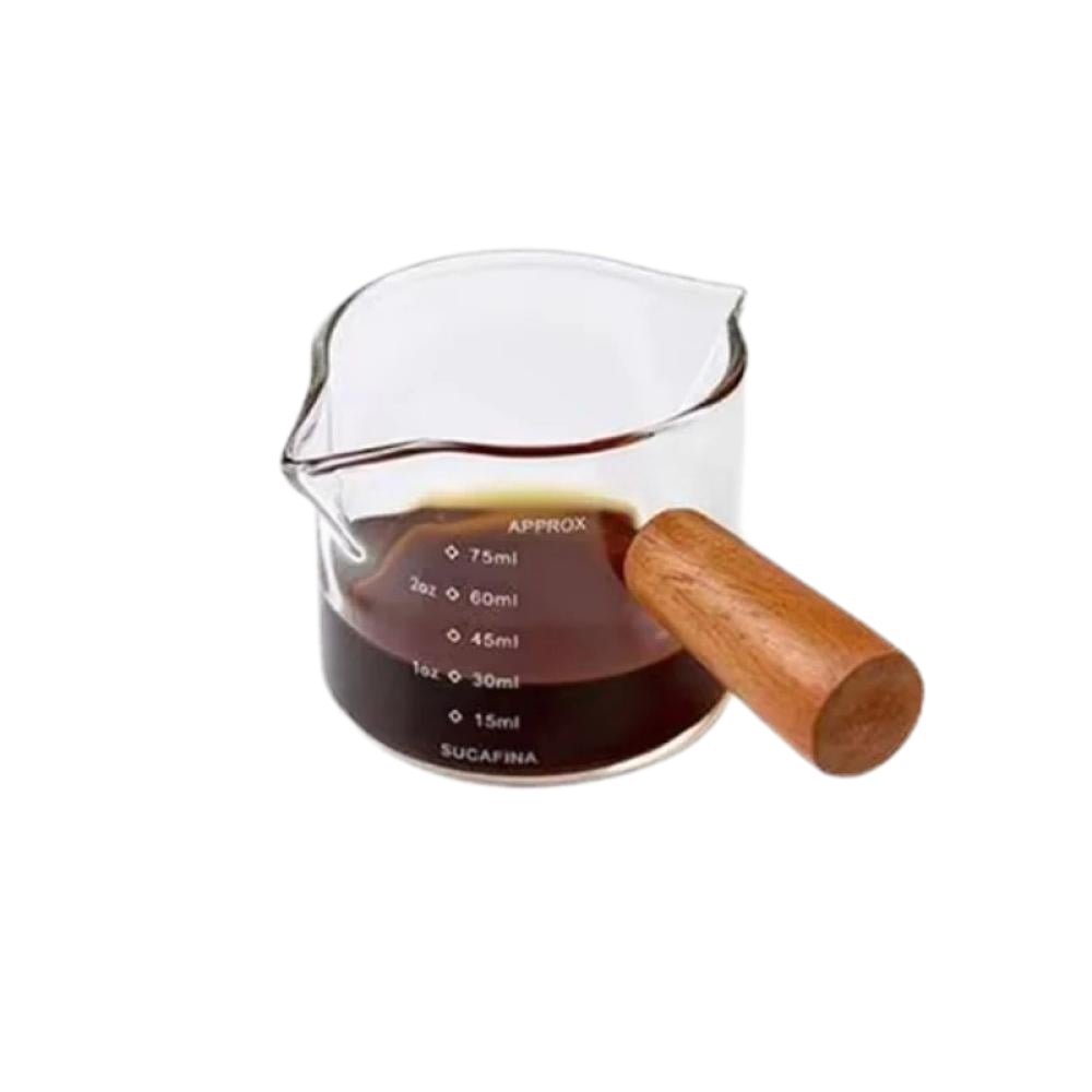 كوب قياس قهوة زجاجي بسعة 75 مل مع مقبض خشبي، مثالي لقياس اسبرسو، اللاتيه، والحليب بدقة. تصميم شفاف وأنيق مع مقياس دقيق، يعد أداة باريستا أساسية لمطبخك وصنع المشروبات المميزة.